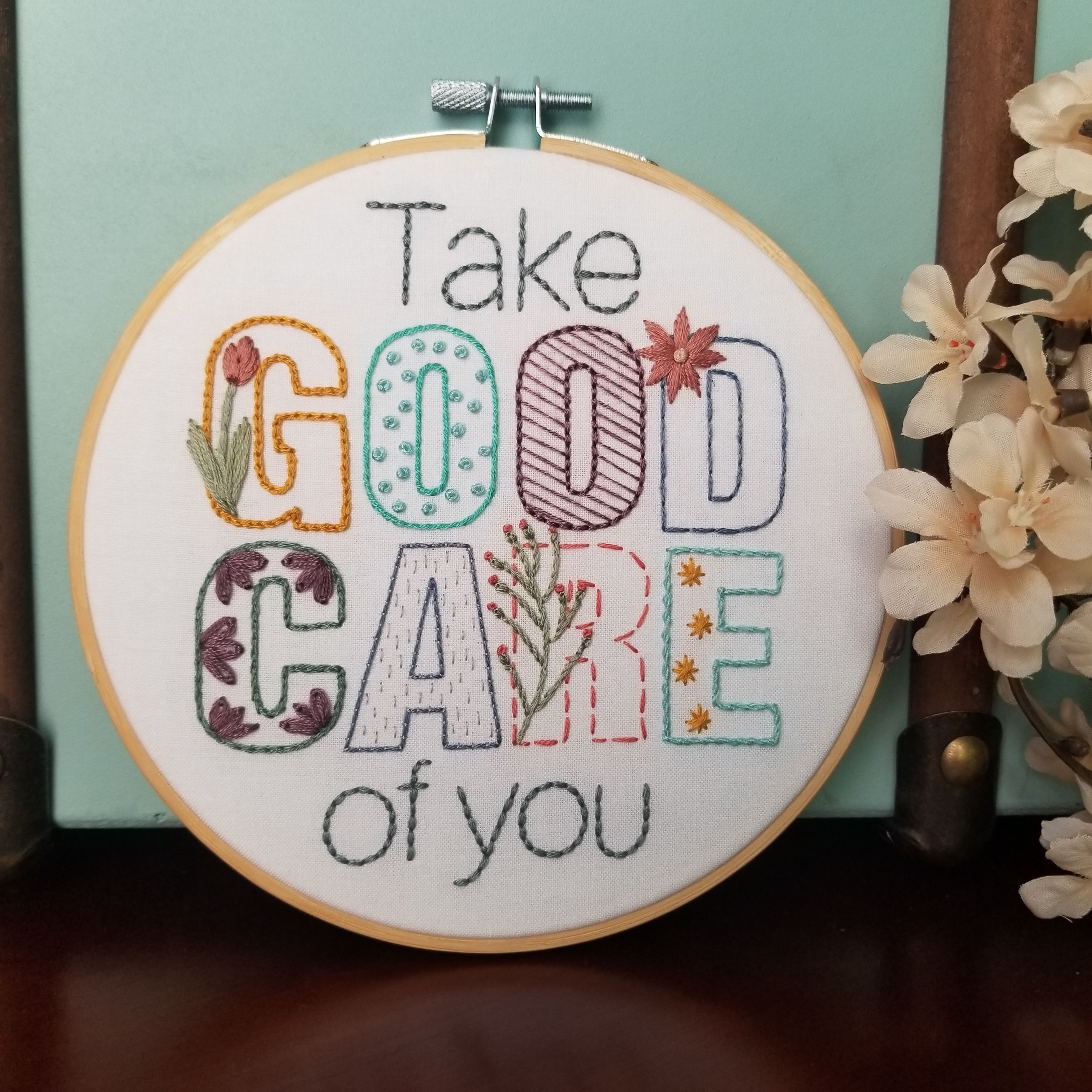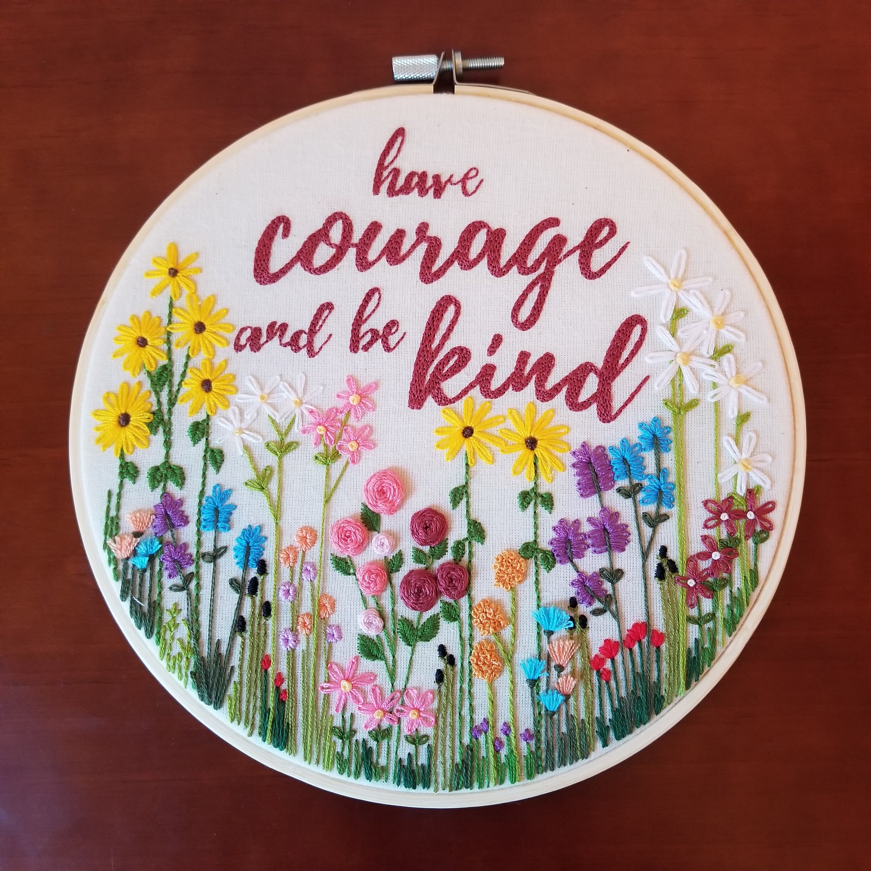 So, I took a break. I challenged myself to stitch again just for me. I shifted my focus to accepting and embracing the inevitable imperfection in all human-made things. I practiced honoring the tedious and therapeutic process of creating something stitch by stitch and purposefully sought to find beauty in the imperfections. I found myself practicing compassion towards myself as an artist, a human, and a mother. I created simple patterns with messages from the things I was learning and hung them up just for me. The process was healing. Not only had embroidery lit a spark in me and given me a creative outlet I desperately needed, but it gently pushed me to face a lifelong battle with perfectionism stitch by stitch, and day by day.